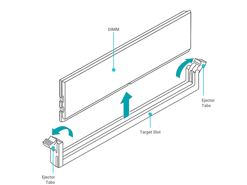 Simultaneously press both ejector clips outward to release the DIMM from the slot.